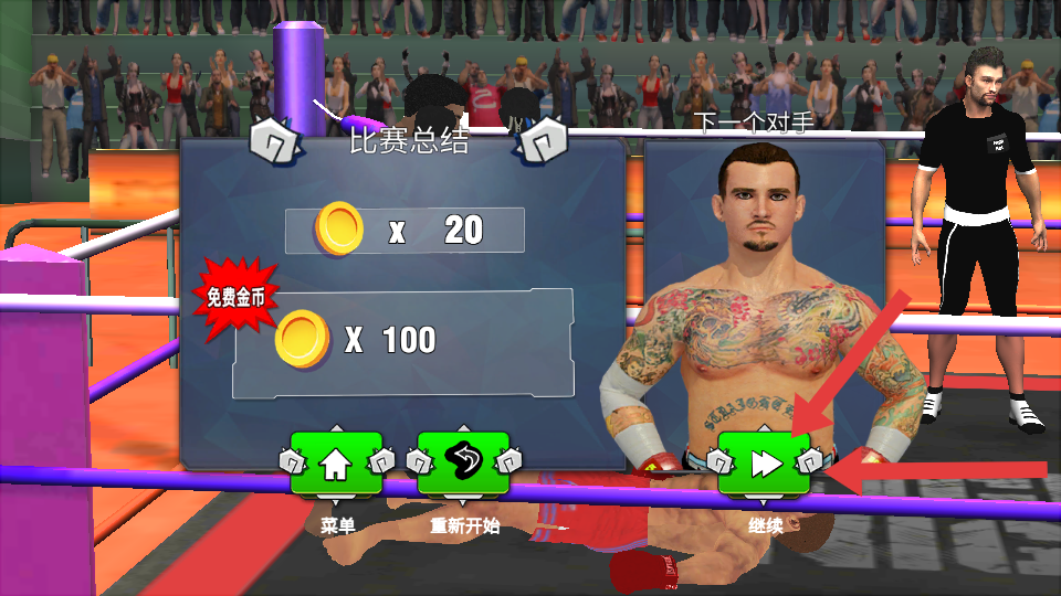 4、贏得比賽后,查看【比賽總結(jié)】獲取金幣獎勵,點擊【繼續(xù)】挑戰(zhàn)下一個對手。