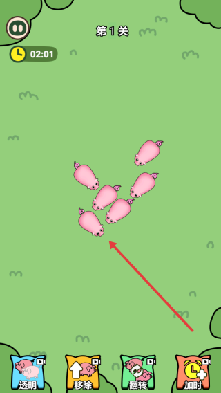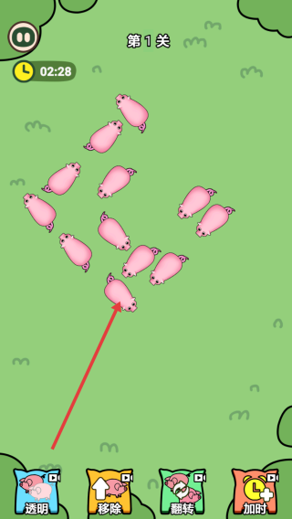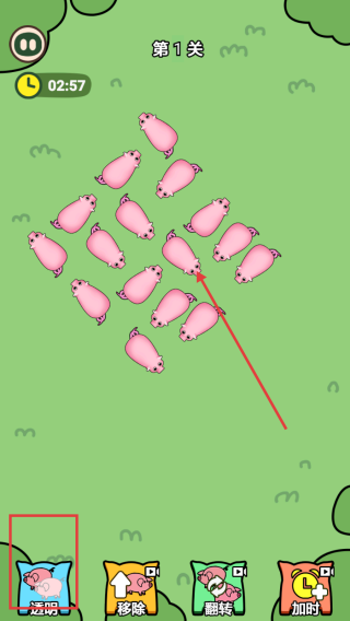2、關(guān)卡中會(huì)有許多小豬,可利用下方的功能道具,如【透明】等,輔助觀察和操作,嘗試聚攏小豬。