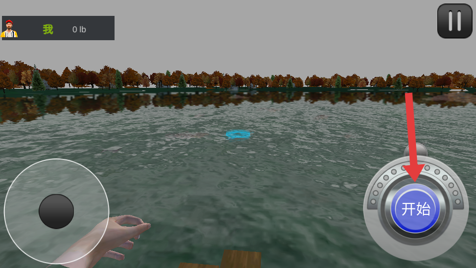 1、進入游戲界面,看到水域場景后,點擊右下方【開始】按鈕,準備釣魚。
