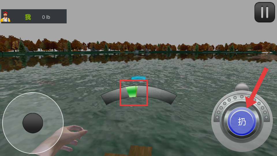 2、看到出現(xiàn)的綠色區(qū)域提示時,迅速點擊【扔】按鈕,將魚鉤扔出。