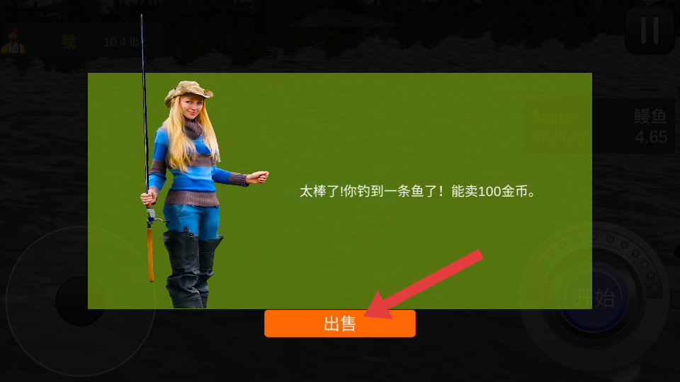 4、成功釣到魚后,在提示界面點擊【出售】按鈕,獲取金幣收益。