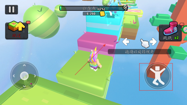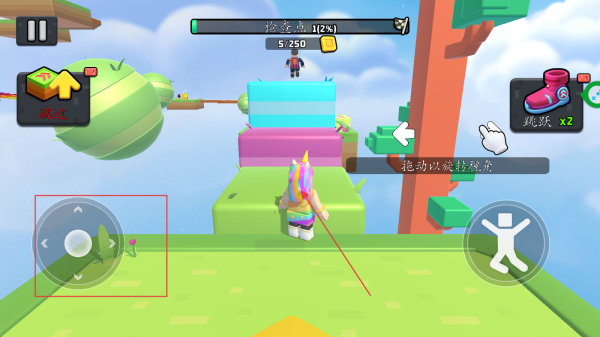2、游戲中,通過左側(cè)搖桿控制角色移動方向,朝著前方的彩色方塊平臺前進。