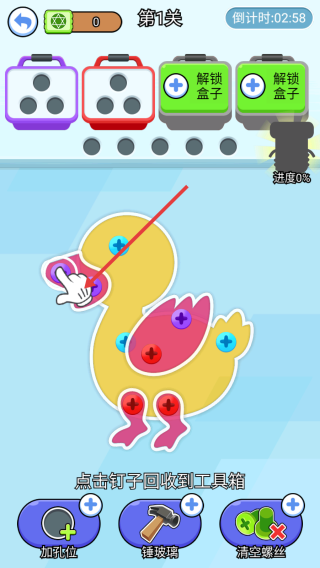 1、進(jìn)入第1關(guān),看到小黃鴨上有不同顏色釘子,根據(jù)提示點(diǎn)擊釘子,將其回收到工具箱,推進(jìn)關(guān)卡。