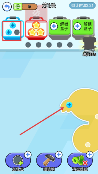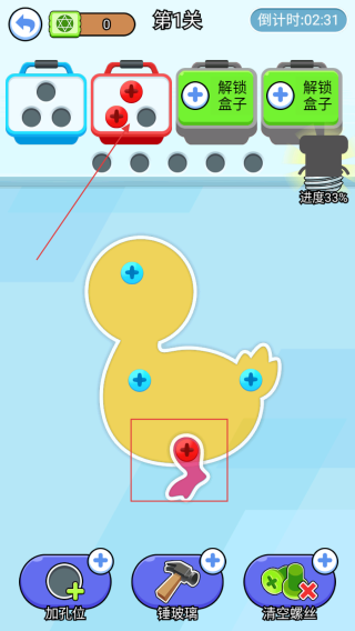 2、持續(xù)點(diǎn)擊小黃鴨上的釘子,回收后會(huì)填充上方的箱子,同時(shí)關(guān)注進(jìn)度條,當(dāng)進(jìn)度到一定程度,小黃鴨會(huì)逐漸變化。