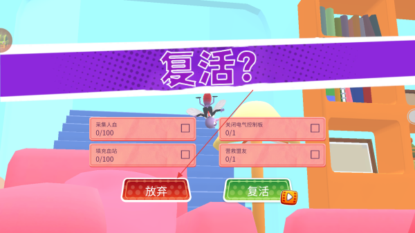 4、若蚊子被擊敗,會(huì)出現(xiàn)“復(fù)活?”界面,可根據(jù)情況選擇【放棄】或【復(fù)活】,繼續(xù)游戲進(jìn)程。