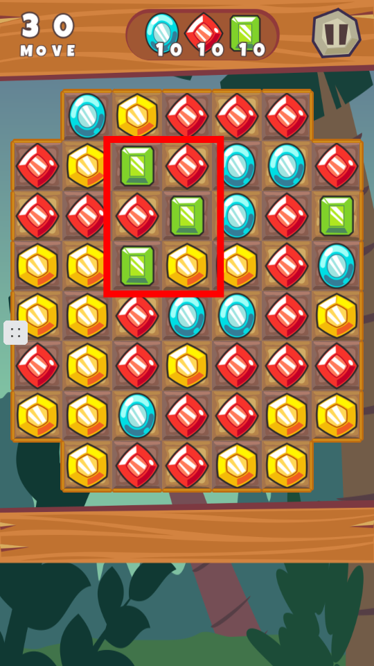 2、進入關(guān)卡后,觀察寶石布局,通過交換相鄰寶石位置,使【3】個及以上相同顏色寶石連成一線進行消除。