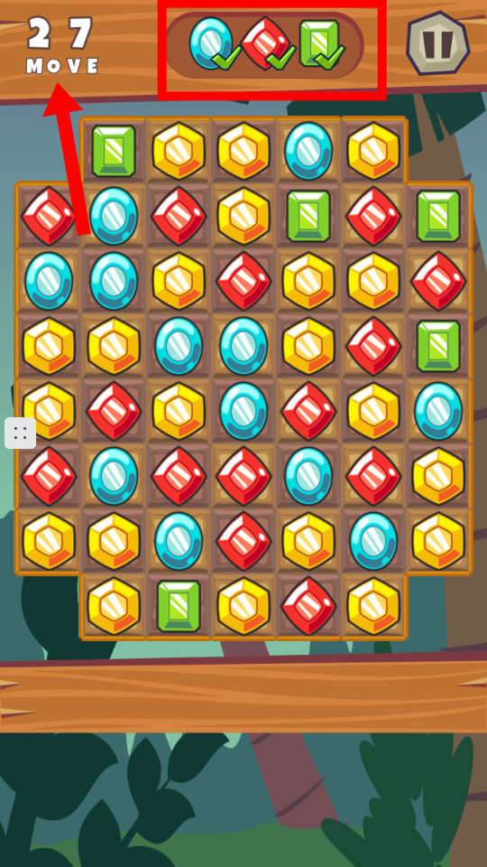 3、留意屏幕上方顯示的不同顏色寶石目標數(shù)量,在【MOVE】次數(shù)限制內(nèi),消除對應(yīng)顏色寶石即可通關(guān)。