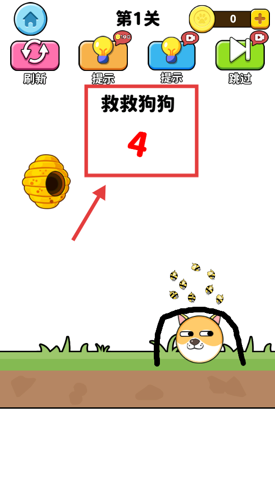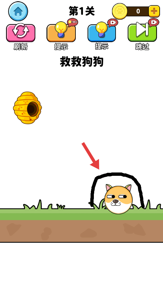 2、在第1關(guān)中,用線條為狗狗畫出拱形防護(hù)區(qū)域,阻擋蜜蜂。