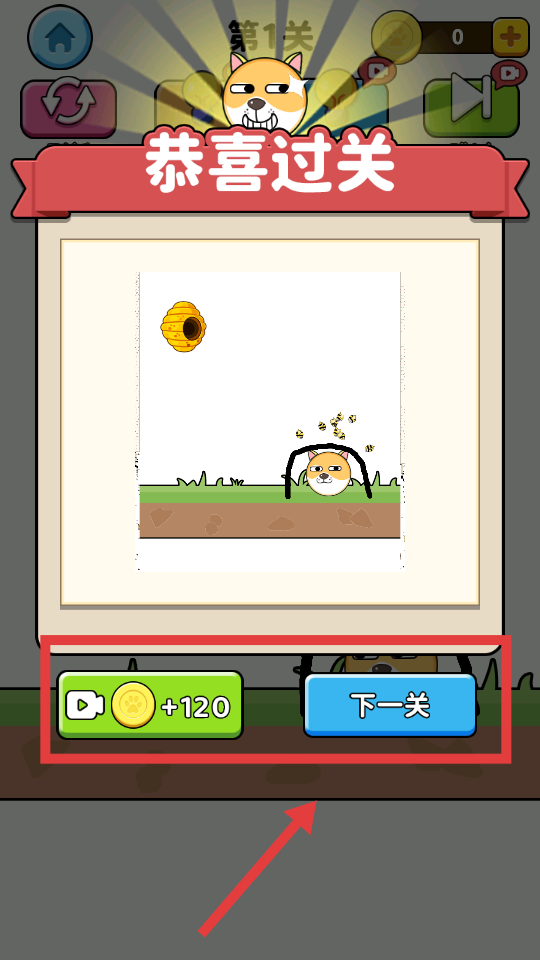 4、成功防護(hù)狗狗后,界面顯示【恭喜過關(guān)】,可選擇看視頻領(lǐng)金幣或點擊【下一關(guān)】。
