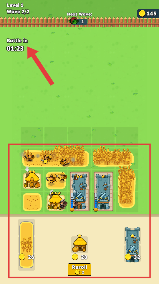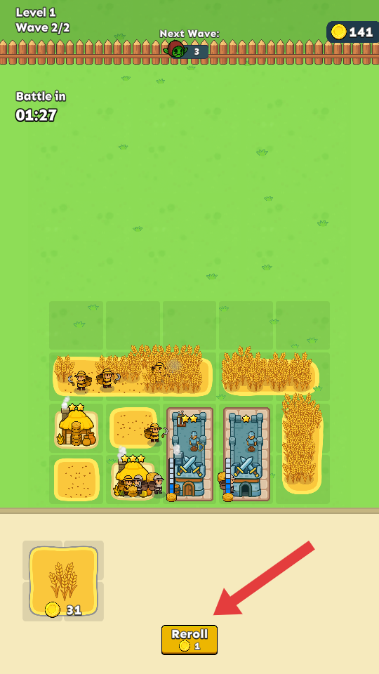 3、戰(zhàn)斗結(jié)束后,點擊【Reroll】按鈕,花費金幣刷新可建造的建筑或單位,提升農(nóng)場和軍隊實力。
