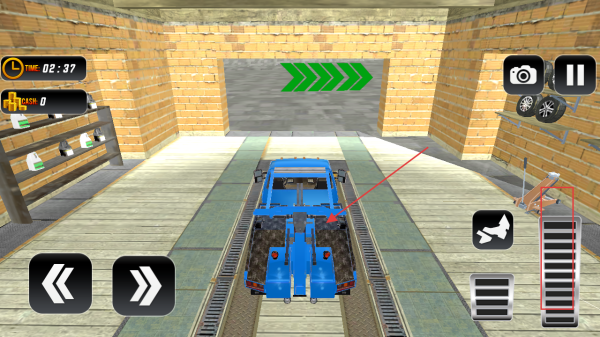2、在車(chē)庫(kù)內(nèi),根據(jù)綠色箭頭指示,操作拖車(chē)移動(dòng),熟悉左右方向鍵等控制方式,為上路救援做準(zhǔn)備。