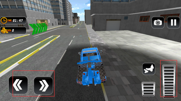 3、駕駛拖車(chē)行駛在城市道路時(shí),利用左右方向鍵控制方向,右側(cè)加速鍵控制速度,沿著綠色箭頭指引的路線前進(jìn)。