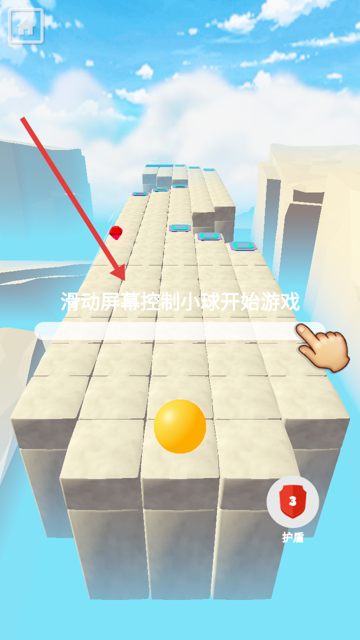 1、滑動屏幕,操控黃色小球在高空石塊跑道場景中開啟游戲挑戰(zhàn),熟悉移動操作。