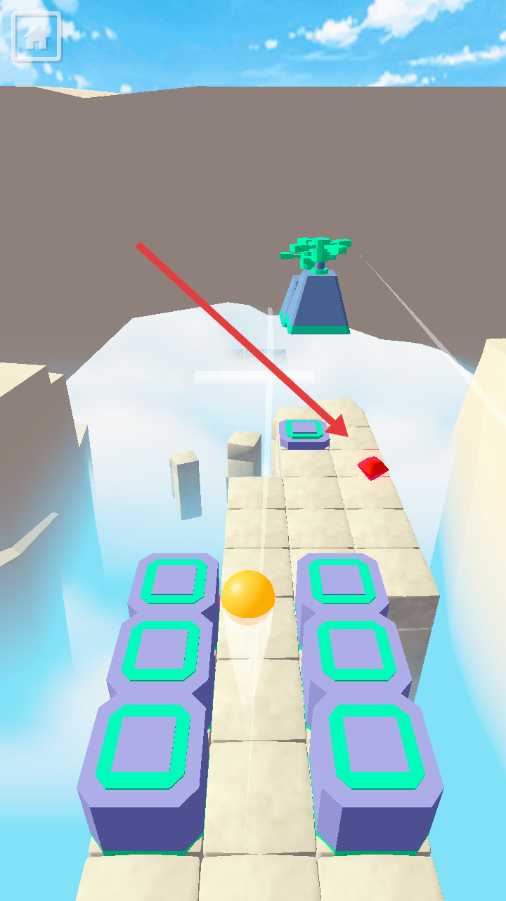 2、操控小球躲避紅色障礙物和綠色炮塔攻擊,在跑道上靈活移動,收集紅色道具,推進關(guān)卡進度。