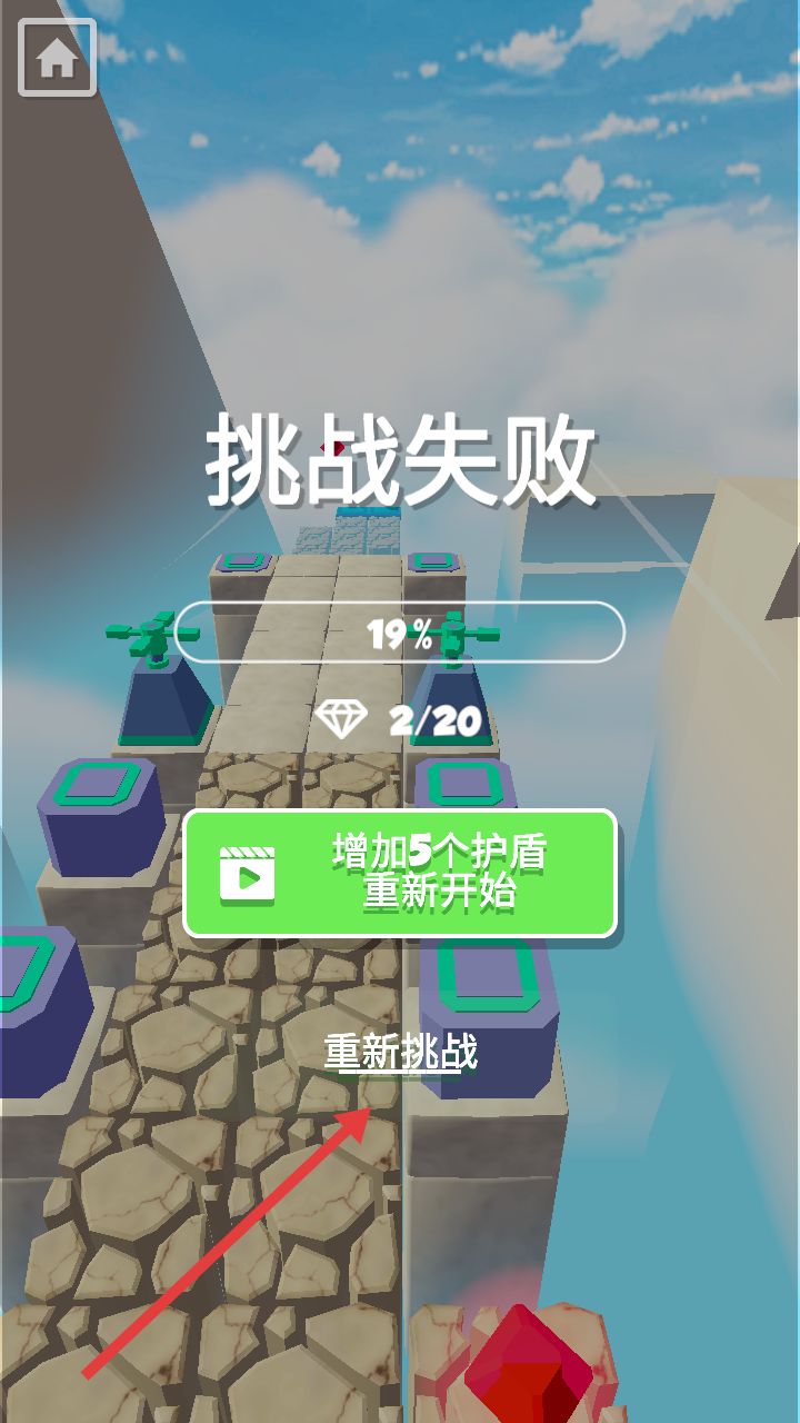 4、若挑戰(zhàn)失敗,點擊重新挑戰(zhàn)按鈕,調(diào)整移動策略,再次嘗試通過關(guān)卡,提升躲避技巧。