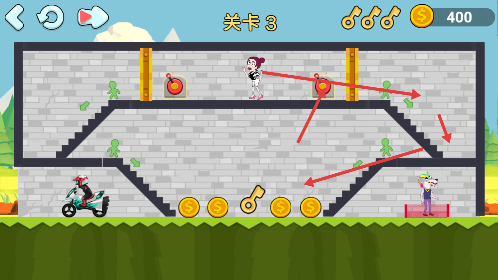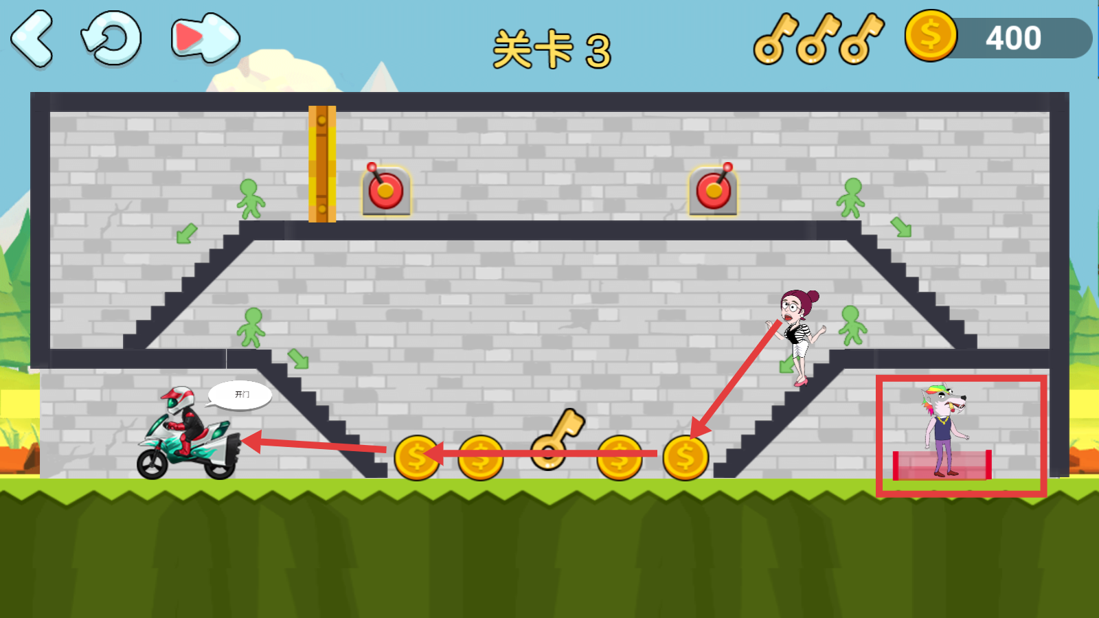 2、在【關(guān)卡3】中,操作機(jī)關(guān),規(guī)劃移動路線,收集鑰匙與金幣,向被困人物方向推進(jìn)。