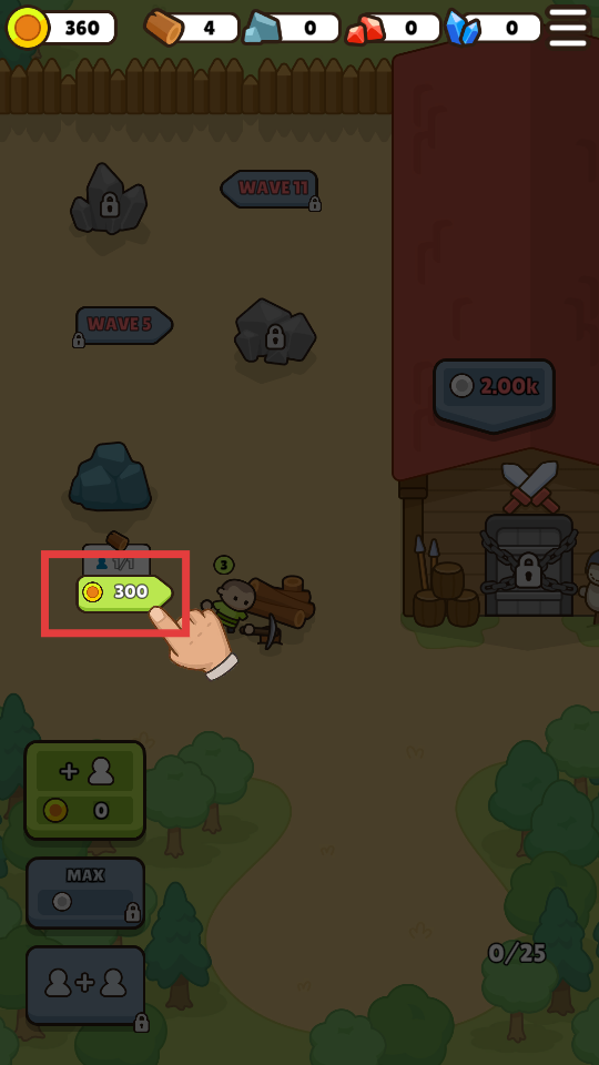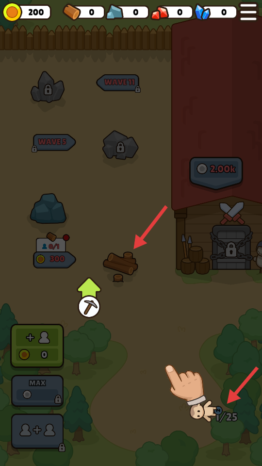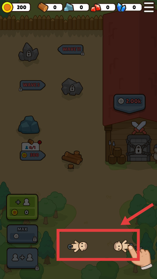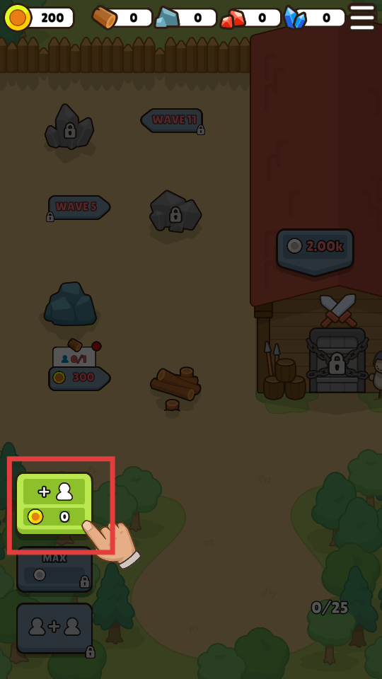 1、游戲開始,點擊綠色【+人物】按鈕,消耗金幣增加人口。
