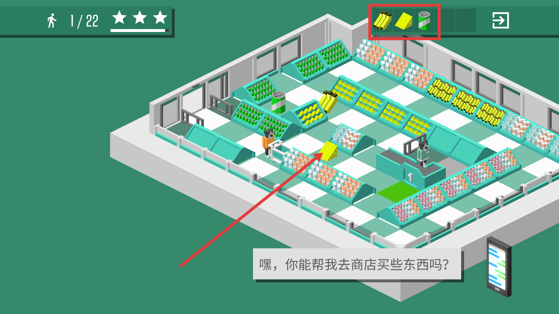 2、進(jìn)入商店場景后,查看右上角的購物清單(如香蕉、黃色物品、綠色罐子等),操控角色移動去尋找這些商品。