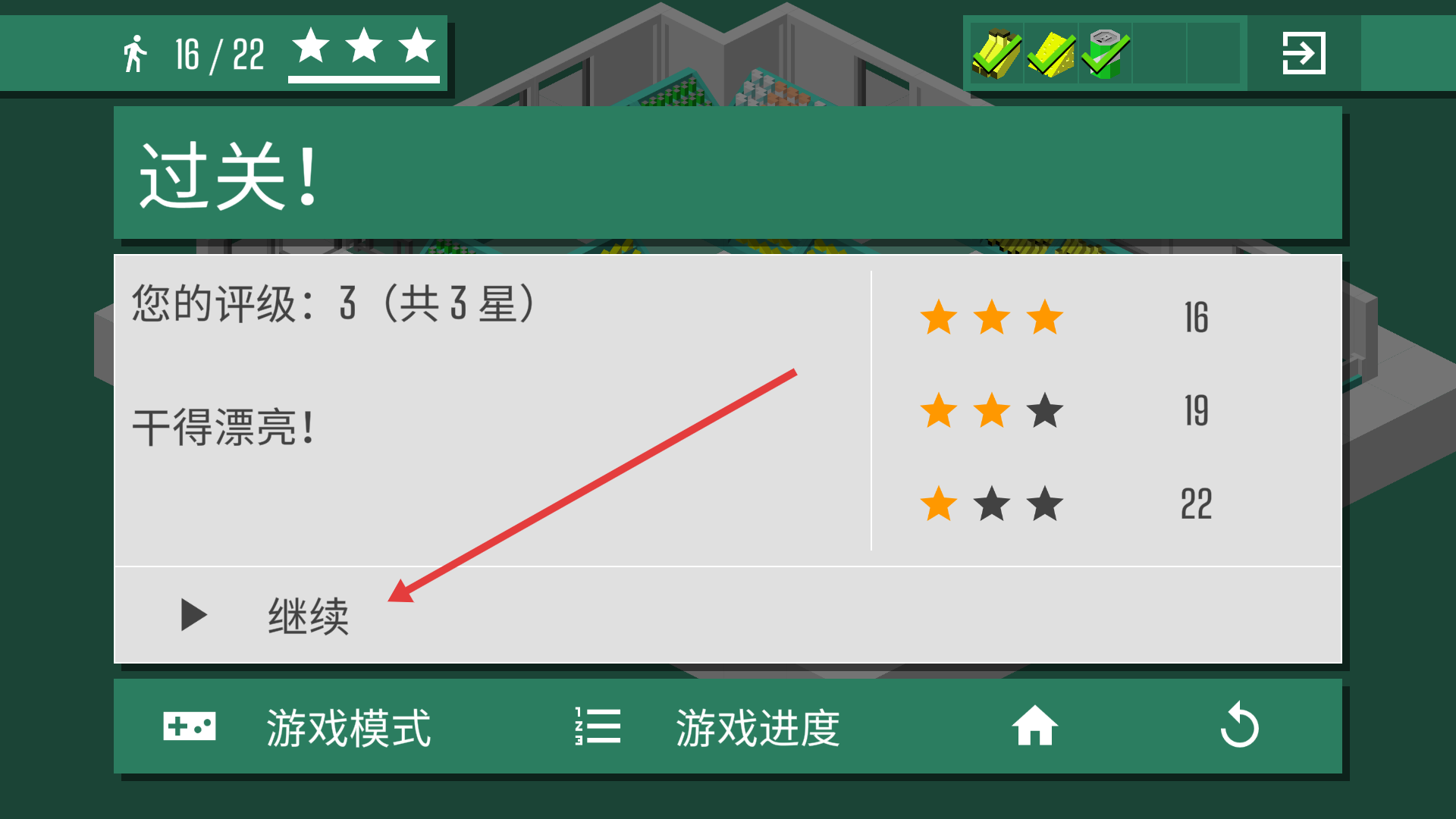 4、成功過關(guān)后,點(diǎn)擊 “繼續(xù)” 按鈕,進(jìn)入下一個關(guān)卡。