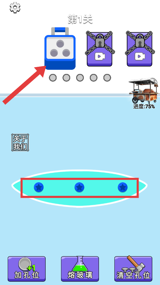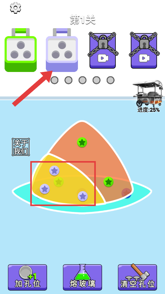 1、進入第一關,先點擊收集【淡紫色螺絲】和上方【淡紫色盒子】進行匹配消除,使木板掉落。