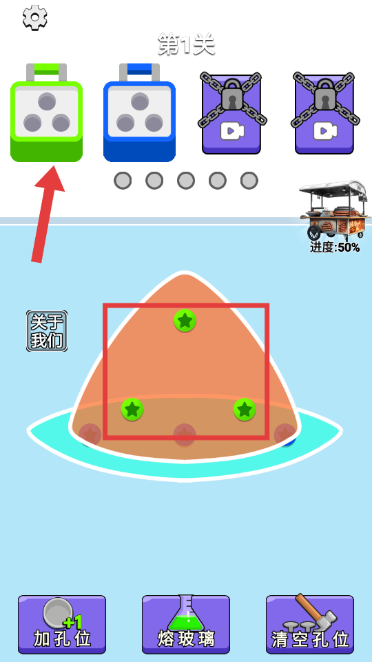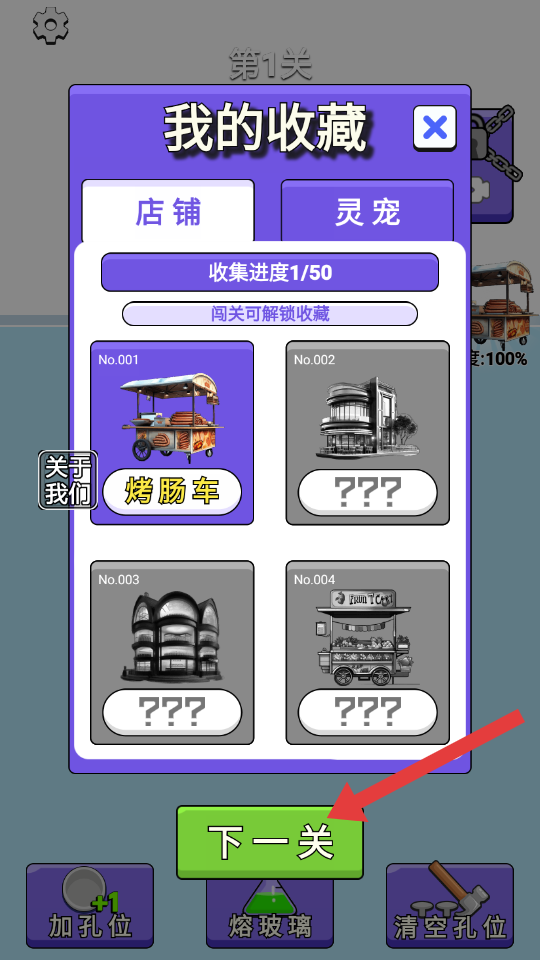 4、完成關卡后點擊【下一關】按鈕,繼續(xù)挑戰(zhàn)新關卡,解鎖【烤腸車】等收藏,提升收集進度。