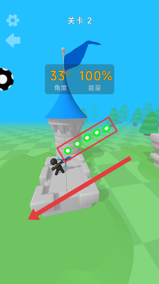 2、開(kāi)始游戲后,【向后滑動(dòng)】屏幕調(diào)整弓箭的角度和能量,瞄準(zhǔn)敵方塔樓【松開(kāi)手】進(jìn)行發(fā)射,通過(guò)綠色瞄準(zhǔn)點(diǎn)精準(zhǔn)打擊目標(biāo)。