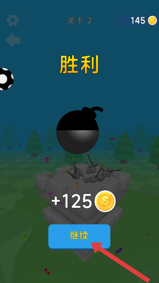 4、關(guān)卡勝利后點(diǎn)擊【繼續(xù)】按鈕,獲取金幣獎(jiǎng)勵(lì),繼續(xù)挑戰(zhàn)下一個(gè)關(guān)卡。