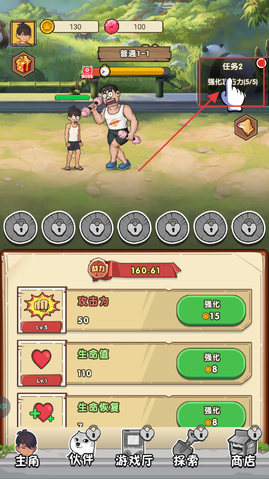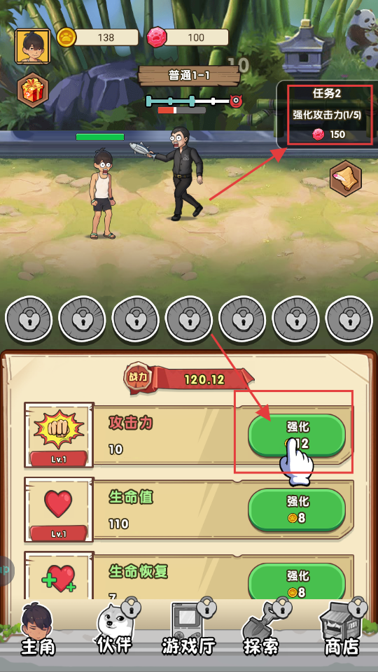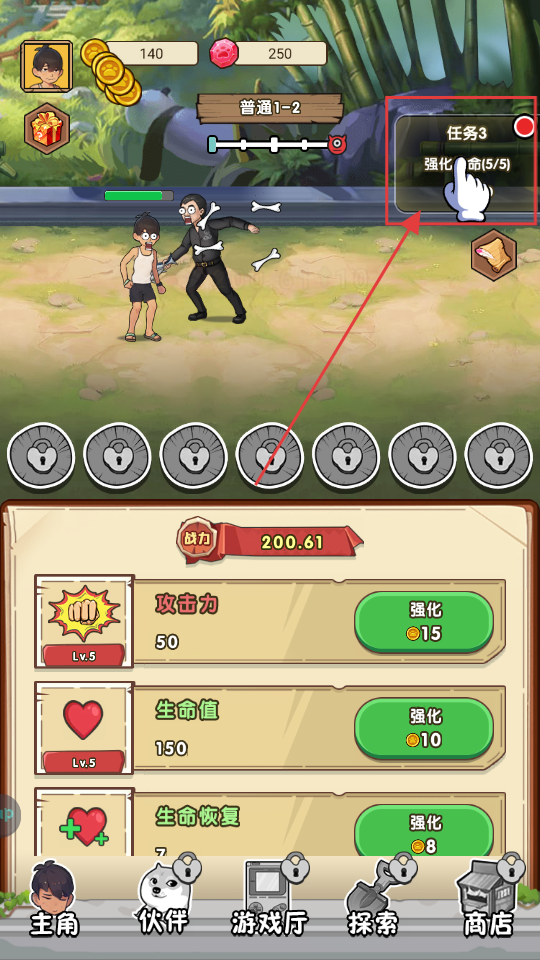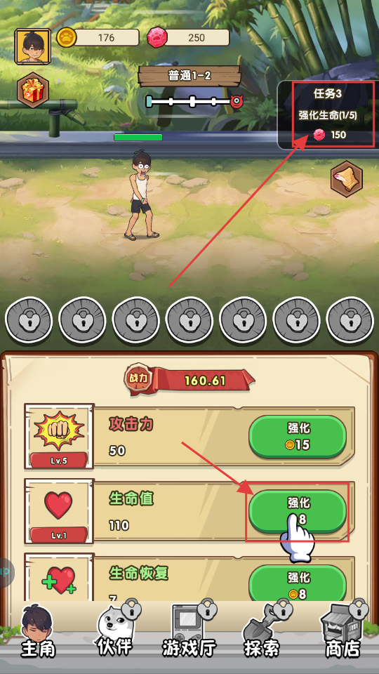 3、根據(jù)新任務(wù)3,點(diǎn)擊生命值旁的【強(qiáng)化】按鈕,消耗金幣強(qiáng)化生命值,增強(qiáng)角色生存能力啦。