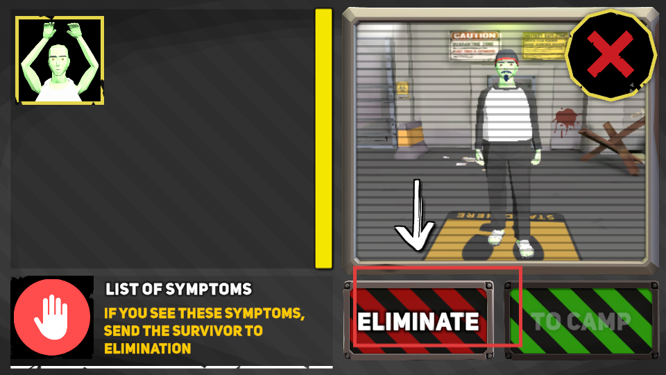 4、根據(jù)癥狀列表,若發(fā)現(xiàn)幸存者有對(duì)應(yīng)癥狀,點(diǎn)擊【ELIMINATE】進(jìn)行處理。