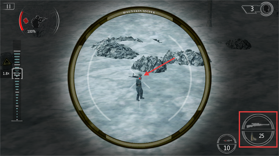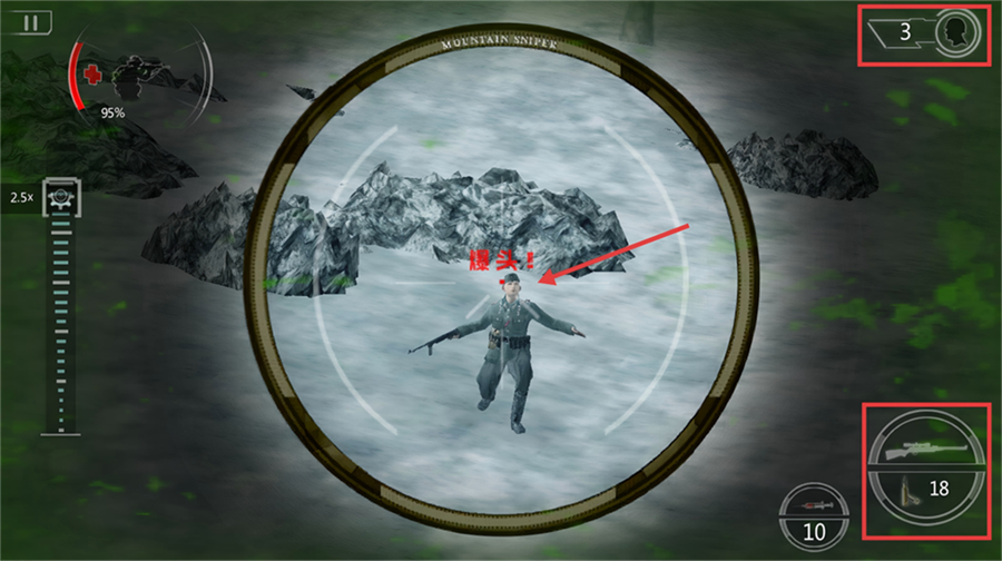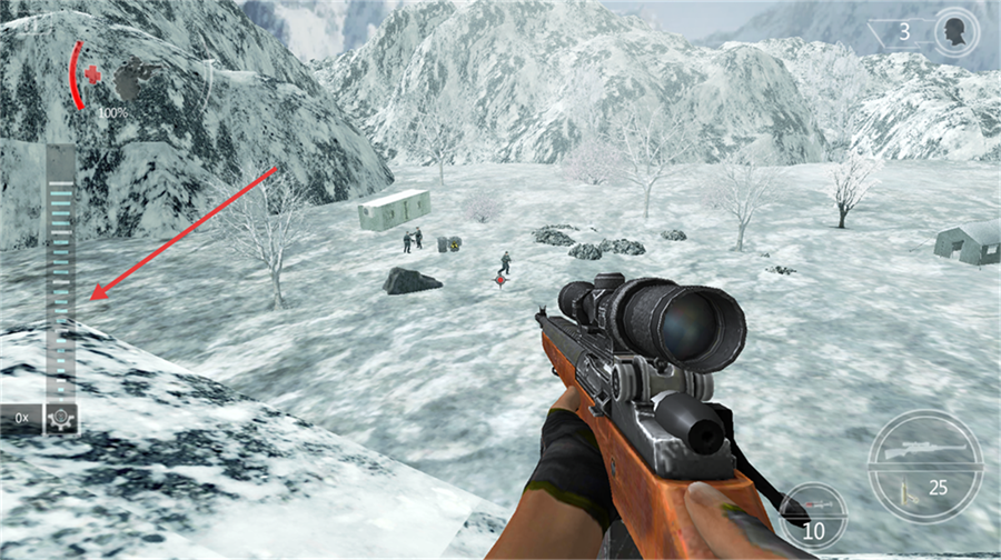 1、進(jìn)入雪地戰(zhàn)場(chǎng),先觀察遠(yuǎn)處敵人的分布,借助地形找好隱蔽位置,再拉動(dòng)左側(cè)滑條放大倍鏡。