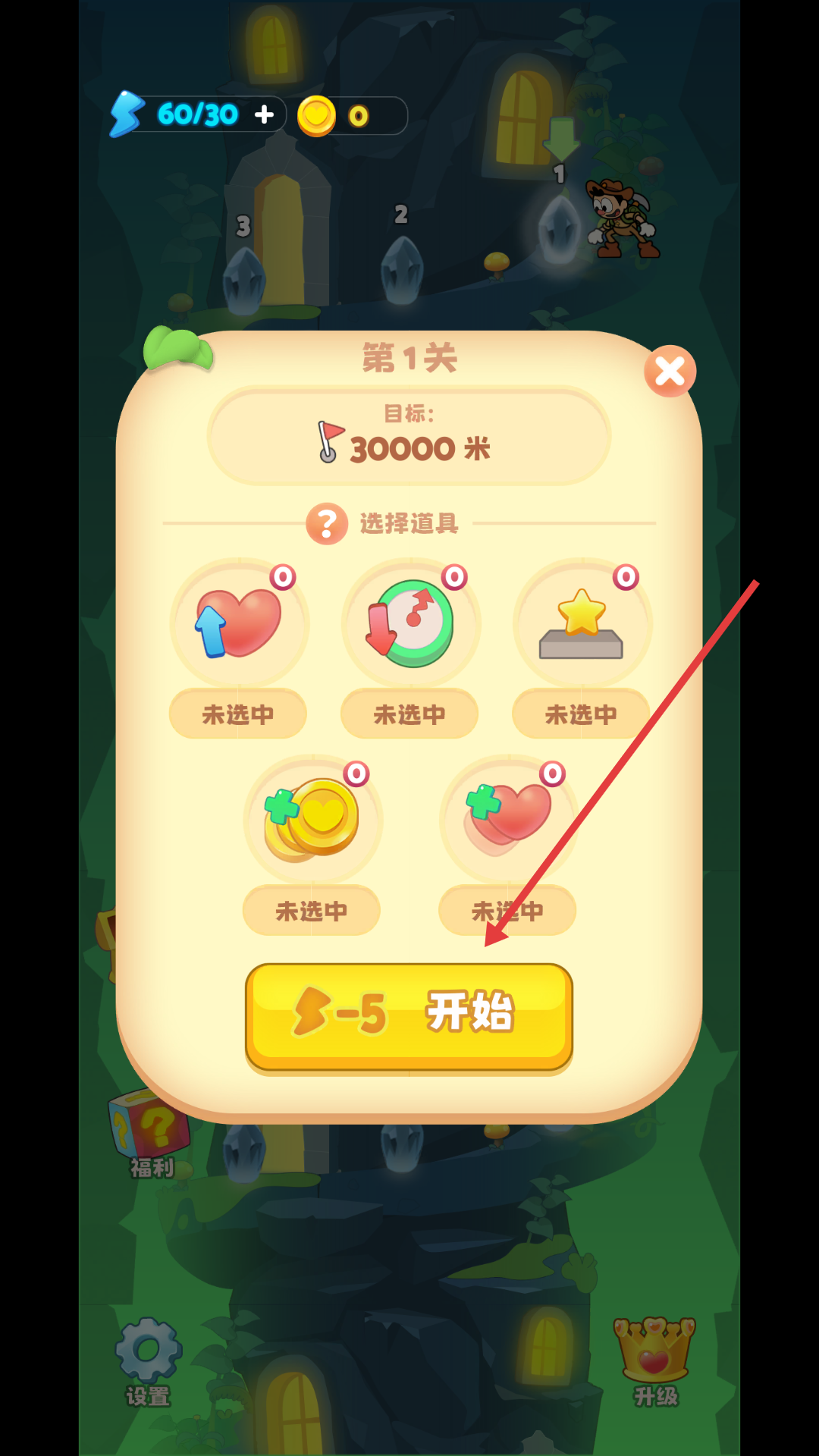 2、在第1關(guān)界面,直接點(diǎn)擊黃色【開(kāi)始】按鈕,進(jìn)入游戲。