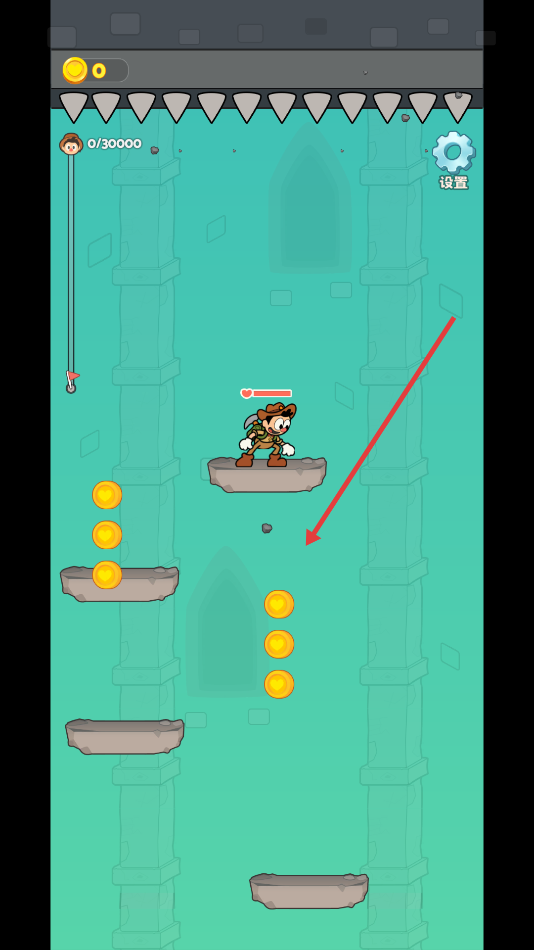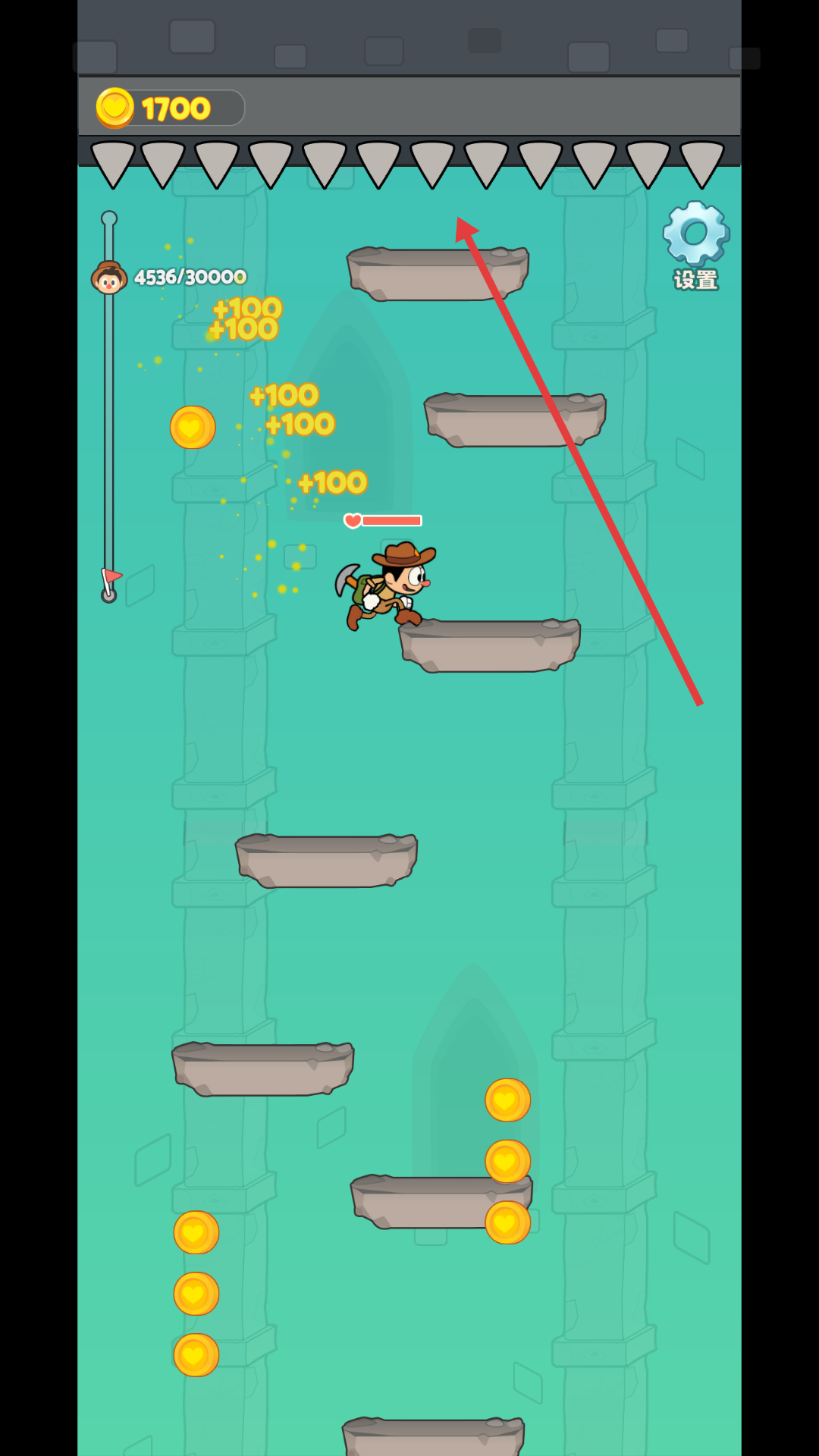 4、繼續(xù)操控角色向上跳躍,注意躲避頂部的尖刺障礙,保持血量健康。