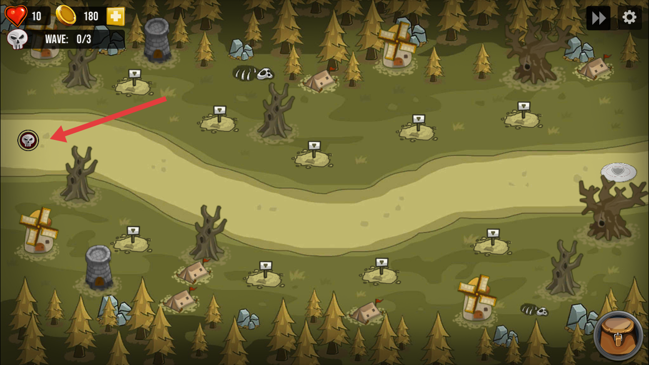 1、在森林地圖場(chǎng)景中,開(kāi)啟塔防挑戰(zhàn),明確敵人從左側(cè)骷髏標(biāo)識(shí)處出現(xiàn),需做好防御準(zhǔn)備,熟悉游戲初始布局。
