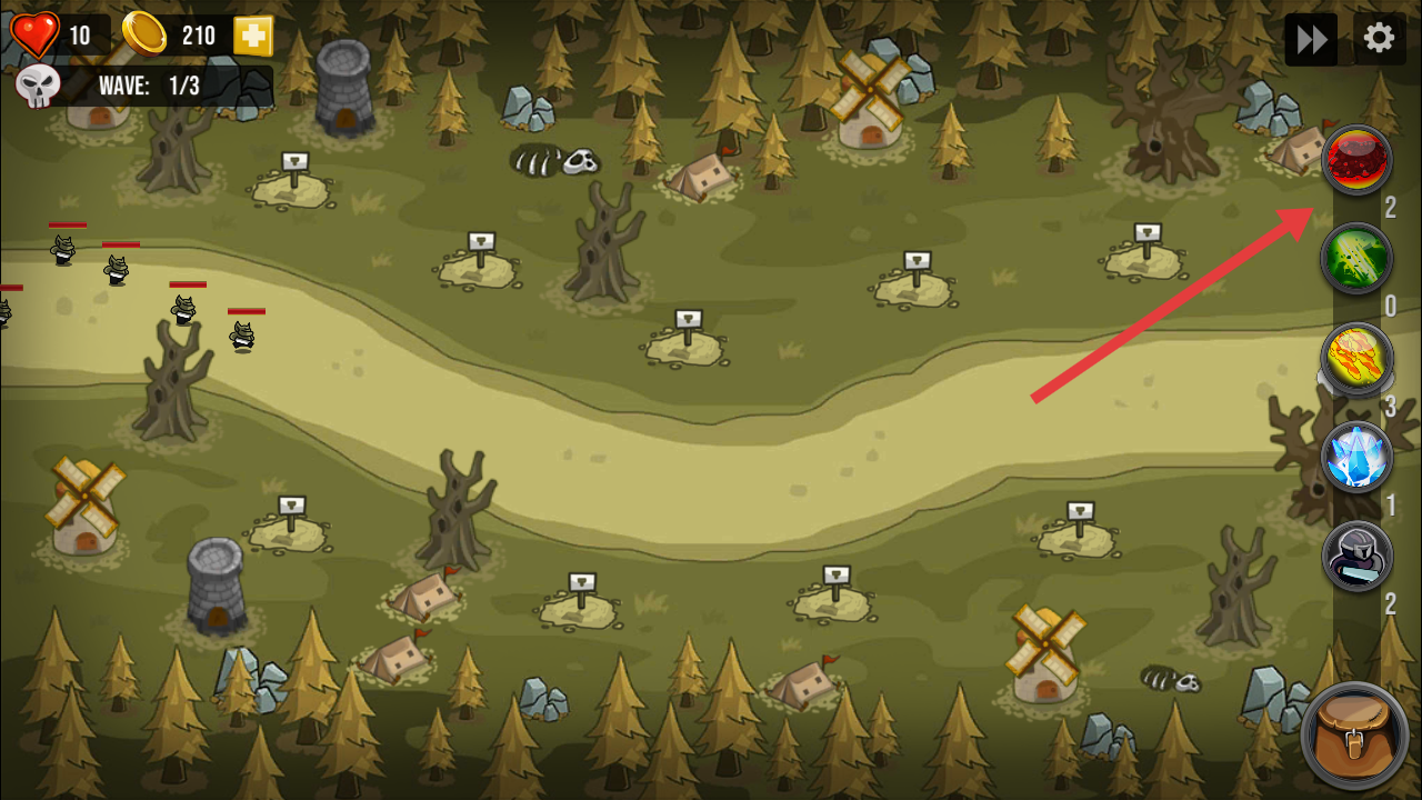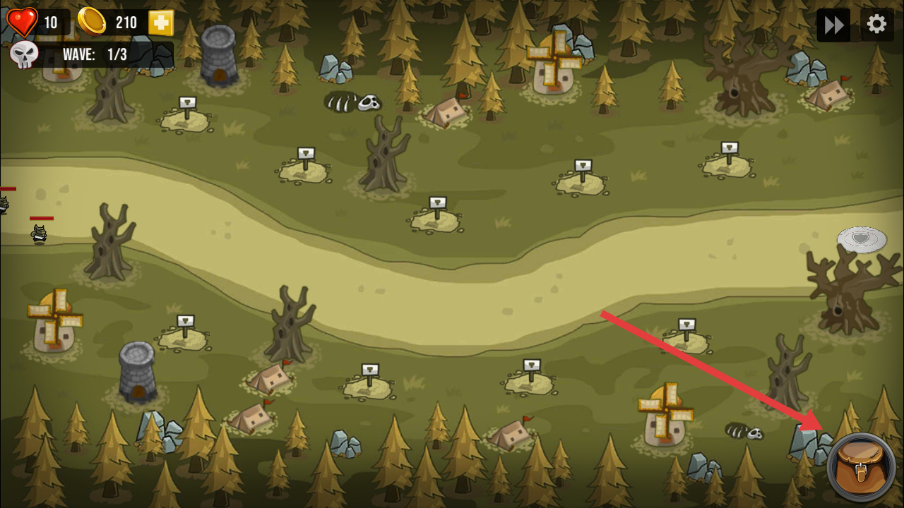 2、點(diǎn)擊右下角背包,使用道具或技能,同時(shí)利用金幣建造防御塔,抵御第一波敵人進(jìn)攻,推進(jìn)關(guān)卡進(jìn)度。