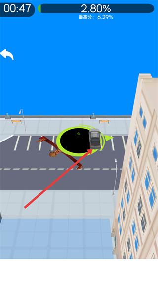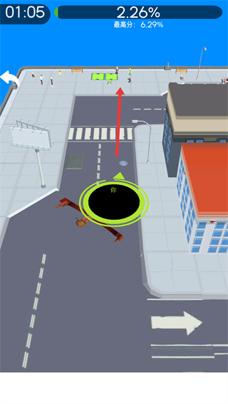 2、操控黑洞移動,向有目標(biāo)的區(qū)域前進,吸收道路上的元素,提升進度。