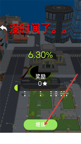 4、當(dāng)時間結(jié)束顯示“沒時間了”時,點擊【繼續(xù)】按鈕,結(jié)算獎勵并繼續(xù)游戲。