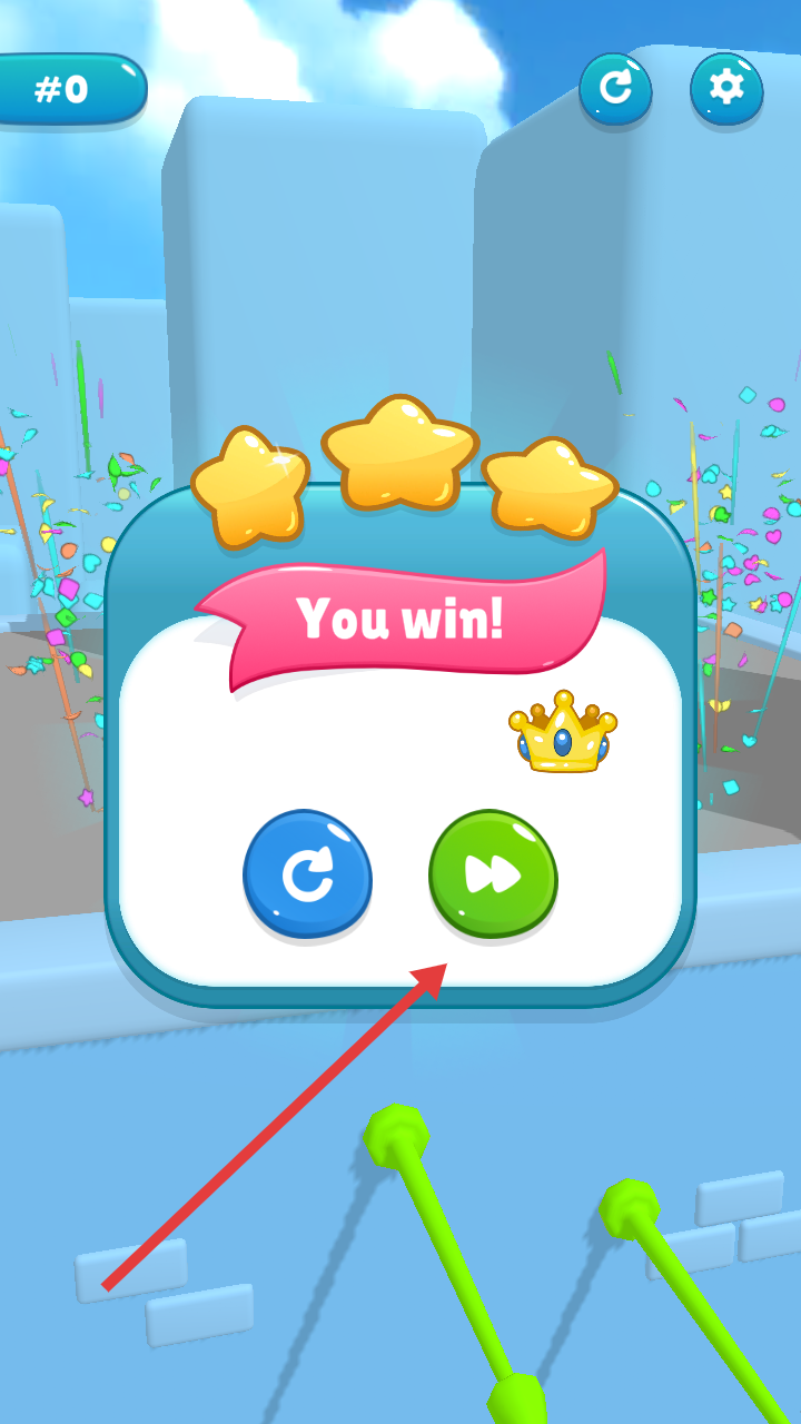 4、關(guān)卡勝利后,點擊綠色前進按鈕進入下一關(guān),總結(jié)移動和躲避技巧,提升游戲表現(xiàn)。