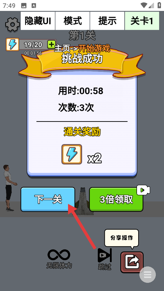 4、挑戰(zhàn)成功后,點(diǎn)擊【下一關(guān)】按鈕,繼續(xù)進(jìn)行后續(xù)關(guān)卡的挑戰(zhàn)。