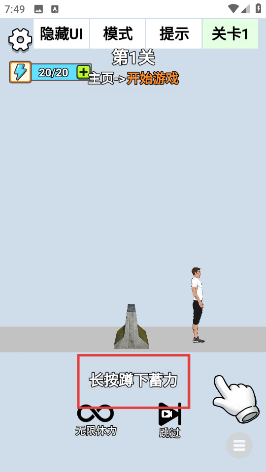 2、在關(guān)卡中,按照提示【長按蹲下蓄力】,為后續(xù)動作做準(zhǔn)備。
