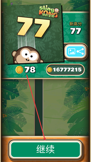 4、游戲結(jié)束后,會顯示得分和金幣收益,點擊“繼續(xù)”按鈕可開啟下一次游戲。