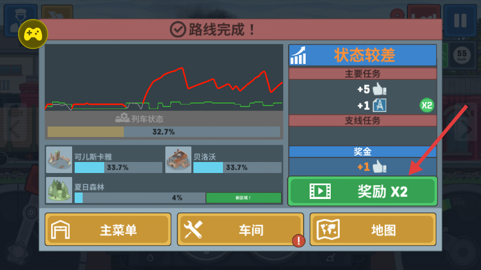 4、路線完成后,點擊【獎勵X2】按鈕獲取雙倍獎勵,積累資源用于火車升級和維護,提升后續(xù)運輸能力。