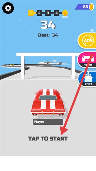 1、點(diǎn)擊【TAPTOSTART】開(kāi)始游戲,開(kāi)啟賽車跑酷挑戰(zhàn),快速進(jìn)入游戲狀態(tài)。