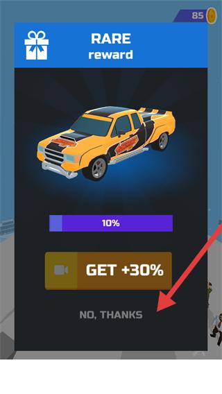 4、獲得稀有車輛獎(jiǎng)勵(lì)時(shí),可根據(jù)需求選擇觀看視頻廣告獲取獎(jiǎng)勵(lì)加成或點(diǎn)擊【NO,THANKS】跳過(guò),靈活管理游戲資源和時(shí)間。