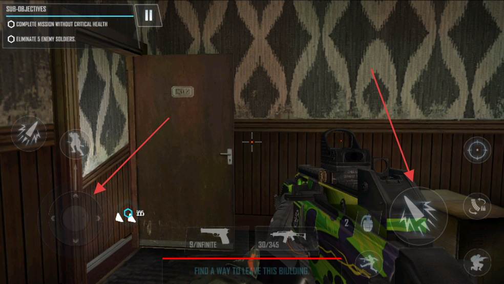 1、操控左側(cè)移動(dòng)搖桿移動(dòng)角色,點(diǎn)擊右側(cè)的按鈕可進(jìn)行攻擊,推進(jìn)建筑內(nèi)探索進(jìn)程。