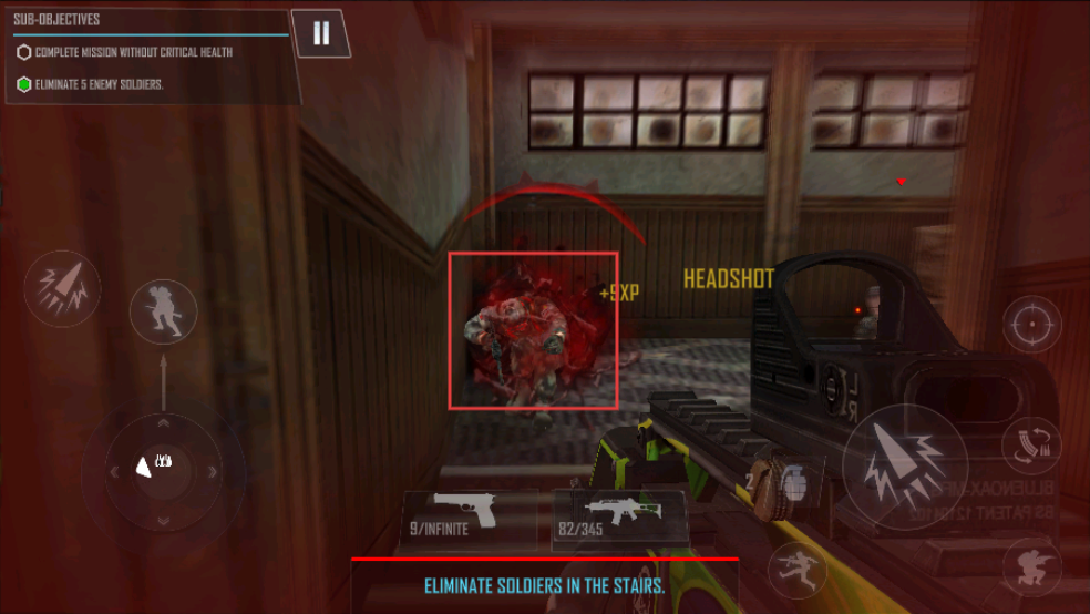 2、在樓梯區(qū)域消滅敵人,達(dá)成【HEADSHOT】可獲得額外經(jīng)驗(yàn),同時(shí)完成子目標(biāo)。