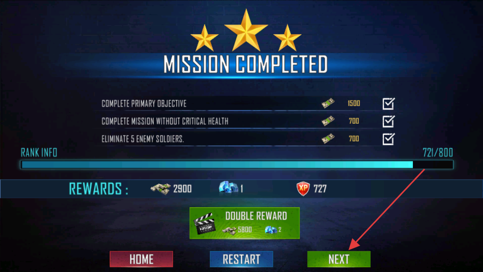 4、任務(wù)完成后,點(diǎn)擊【NEXT】按鈕可進(jìn)入下一個(gè)任務(wù),同時(shí)領(lǐng)取包括金幣、鉆石和經(jīng)驗(yàn)在內(nèi)的豐厚獎(jiǎng)勵(lì)。