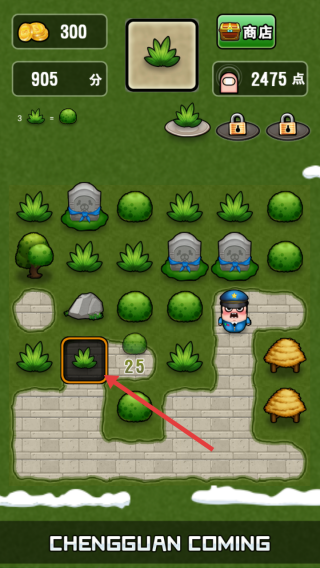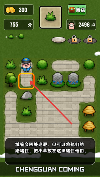2、根據(jù)提示,將小草放置在城管的路徑上,堵住其路線,阻止城管巡邏,完成基礎(chǔ)操作任務(wù)。