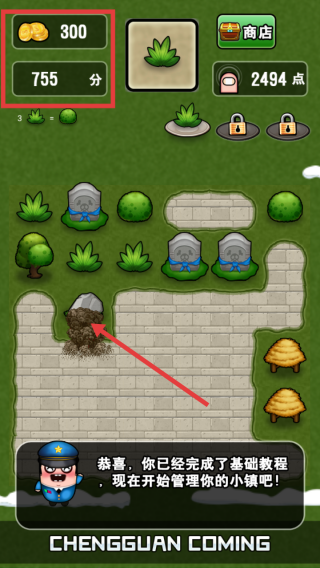 3、完成基礎(chǔ)教程后,關(guān)注左上角【金幣-300】和【分?jǐn)?shù)-755】,繼續(xù)經(jīng)營小鎮(zhèn)以獲取更多資源和分?jǐn)?shù)。