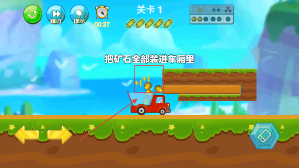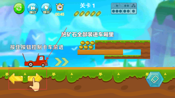 2、在關(guān)卡1中,按住方向按鈕控制卡車前進(jìn),目標(biāo)是把礦石全部裝進(jìn)車廂里,注意時間限制。