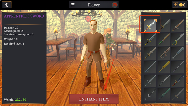 1、查看武器屬性,為角色裝備【Apprentice's-Sword】,通過【ENCHANT-ITEM】強(qiáng)化裝備,提升戰(zhàn)斗能力。